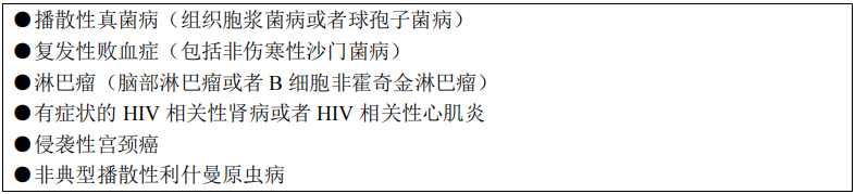 感染HIV后的終末階段。患者CD4+T淋巴細胞計數(shù)多<200個/μL。此期主要臨床階段表現(xiàn)為HIV相關癥狀、體征及各種機會性感染和腫瘤。